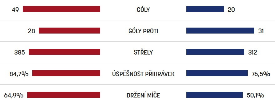 Sparta patří také mezi statisticky dominantní týmy soutěže – vstřelila 49 branek, vyprodukovala 385 střel a je lídrem ve třech následujících statistikách - procentuální úspěšnosti střel (12,7%), úspěšnost přihrávek 84,7 % a průměrné držení míče 64,9 %.